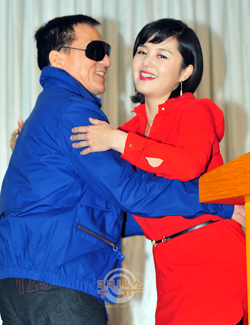 [쿠키 영화] 배우 성룡이 18일 오후 서울 소공동 롯데호텔에서 열린 영화 ‘차이니스 조디악’ 기자회견에서 사회자로 참석한 방현주 아나운서와 포옹하고 있다.