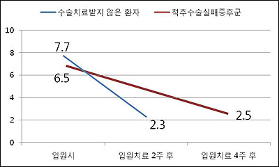 입원 전과 4주 치료 후를 비교분석결과, 단기간에 70% 이상의 통증이 감소돼 호전되는 효과를 나타냈다. 척추수술 실패증후군으로 허리통증과 다리저림, 하지방사통 등이 지속되고 일상생활을 유지하기 힘들 때 모커리한방병원의 입원집중치료를 시행한 결과 단기간에 허리통증은 평균 6.5에서 2.5로, 하지방사통은 6.0에서 2.0으로 감소돼 70% 정도 호전됐다.