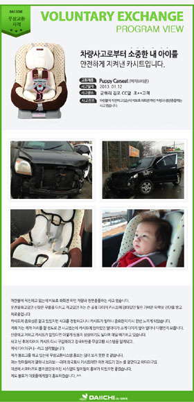다이치에서는 지난 2007년부터 무상교환 프로그램을 실시하고 있다. 유아용카시트는 눈에 보이지 않는 작은 손상과 경미한 충격만으로도 카시트의 성능 절반 이하가 저하될 수 있기 때문이다. 다이치에서는 사고경력이 있거나 출처불명의 중고 카시트의 사용은 오히려 어린이에게 치명적인 위험이 될 수 있다고 판단해 이 같은 제도를 실시하고 있다고 전했다.
