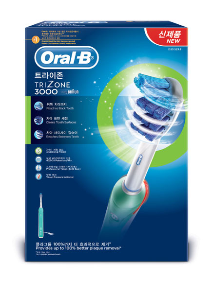 [쿠키 건강] 구강관리 전문브랜드 오랄-비(www.oral-b.co.kr)는 분당 48,800번의 움직임으로 일반칫솔 대비 2배 더 플라그(치태)를 제거해주는 전동칫솔, 트라이존 3000(Trizone 3000)을 출시했다.