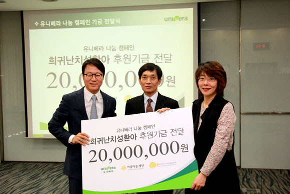 나눔캠페인은 유니베라의 대표적인 기부형 사회공헌 활동으로 아름다운 재단을 통해 한국희귀난치성질환 연합회에 전달되는 기금으로 희귀난치성 질환에 고통받는 환아들을 위해 운영되는 사회공헌활동이다. 이번 캠페인은 2011년 6월부터 2012년 7월까지 진행한 것으로 총 2000만원을 모금했다. 전달식에는 유니베라 이병훈 대표이사와 아름다운재단 김미경 사무총장, 한국희귀난치성질환 연합회 신현민 회장이 참석했다.