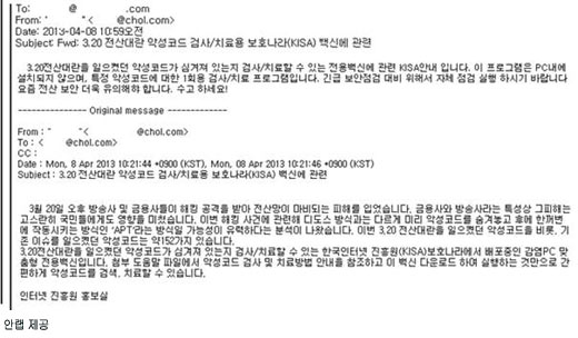 공격자는 ‘chol.com’의 메일 계정을 사용해 chol.com 메일 계정을 가진 특정인에게 이메일을 보낸다. 메일 제목은 ‘3.20 전산대란 악성코드 검사/치료용 보호나라(KISA) 백신에 관련’이며, 본문은 ‘3.20 전산대란을 일으켰던 악성코드가 숨겨져 있는지 검사·치료할 수 있는 전용백신에 관련 KISA 안내입니다’로 시작된다. 본문 말미에는 ‘인터넷 진흥원 홍보실’로 메일 작성자를 가장했다.