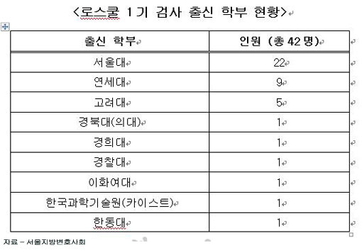 서울지방변호사회는 15일 법률신문사에서 발간한 법조인대관과 그 밖의 자료를 통해 로스쿨 1기 검사들의 출신 학부를 조사한 결과 2012년 법무부가 임용한 로스쿨 1기 검사 42명 중 85.7%에 해당되는 36명이 서울대, 고대, 연대 등 소위 ‘SKY 대학’ 학부 출신이었다고 밝혔다. 이 중 서울대 출신은 22명으로 52.4%에 달했다.