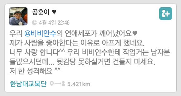 공개된 글을 통해 커플녀는 SNS 사용자들에게 “멋진 여성 유저분들^^ 우리오빠한테 사적인 용건으로 전화하지 마세요. 쪽지하지 마세요. 쓸데없는 고민은 친구한테 털어 놓으세요. 우리오빤 심심풀이용 아닙니다. 여자분들 걸리지 마라 죽는다^^ 불끈”이라고 남친에게 관심을 보이는 여성 유저들에게 경고했다.