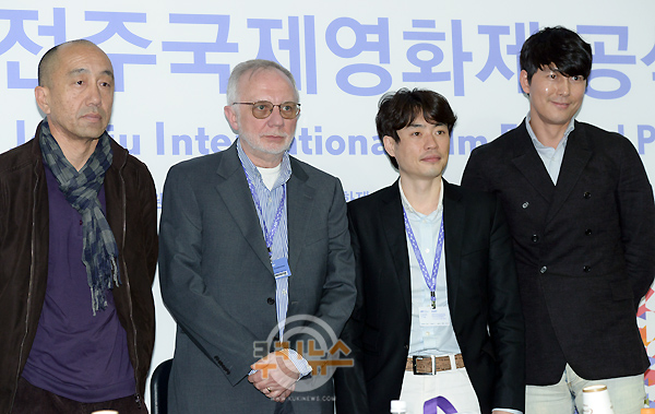 [쿠키 연예] 26일 오후 전북 전주시 고사동 전주영화제작소에서 제14회 전주국제영화제 ‘국제경쟁 심사위원’ 기자회견이 열렸다. 심사위원 다레잔 오미르바예프와 돈 프레드릭슨, 류승완, 정우성이 취재진에게 포즈를 취하고 있다.