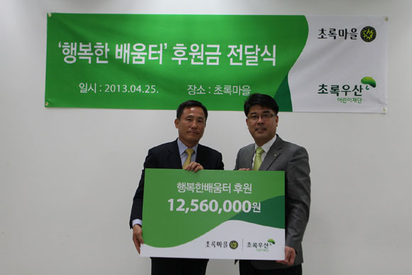 [쿠키 건강] 초록마을이 지난 4월 26일 상봉동 초록마을 본사에서 어린이재단 ‘초록우산’과 ‘행복한 배움터’ 후원 협약식을 갖고 1256만원의 후원금을 전달했다.