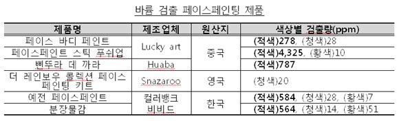 이어 "페이스페인트는 색조화장품에 해당되므로 화장품법에 따라 포장에 원료 전성분 표시 등을 해야 하지만 표시사항을 준수한 제품은 하나도 없었다"며 "특히 수입 2개 제품에서는 국내에서 허용되지 않은 3개 색소를 원료로 사용하고 있어 관리감독의 강화가 시급하다"고 전했다.
