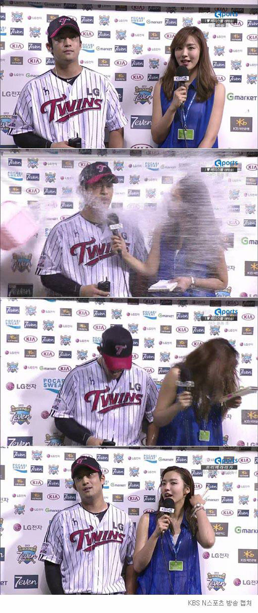 임찬규는 26일 SK에 맞서 끝내기 안타로 LG를 승리로 이끈 정의윤에게 물을 뿌리는 세리모니(사진)를 펼쳤다. 이 때 정의윤과 인터뷰 중이던 KBS N 스포츠 정인영 아나운서가 고스란히 물벼락을 맞으면서 방송 직후 임찬규와 LG 구단에 대한 비난이 쏟아지고 있는 상황이다.