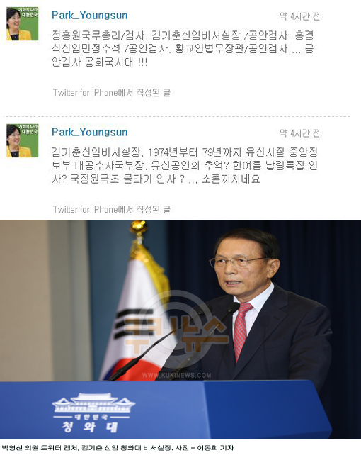 박 의원은 이날 청와대 인선 발표 직후 자신의 트위터에 “김기춘 신임 비서실장. 1974년부터 1979년까지 유신시절 중앙정보부 대공수사국부장. 유신공안의 추억? 한여름 납량특집 인사? 국정원 국조 물타기 인사?…소름끼치네요”라는 글을 남겼다.