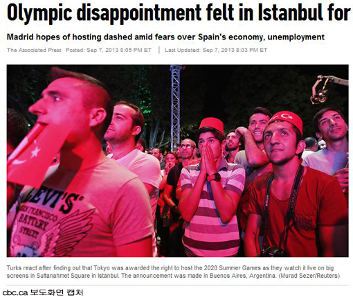 [쿠키 지구촌] 7일(현지시간) 아르헨티나 부에노스아이레스에서 열린 국제올림픽위원회(IOC) 총회에서 일본 도쿄가 2020년 하계올림픽 개최지로 선정되자 유치 경쟁을 벌여온 스페인(마드리드), 터키(이스탄불) 국민들은 크게 낙담했다. 특히 일본이 ‘원전 방사능 유출’이라는 ‘대형 악재’를 안고 있었기 때문에 실망감은 더욱 컸다.