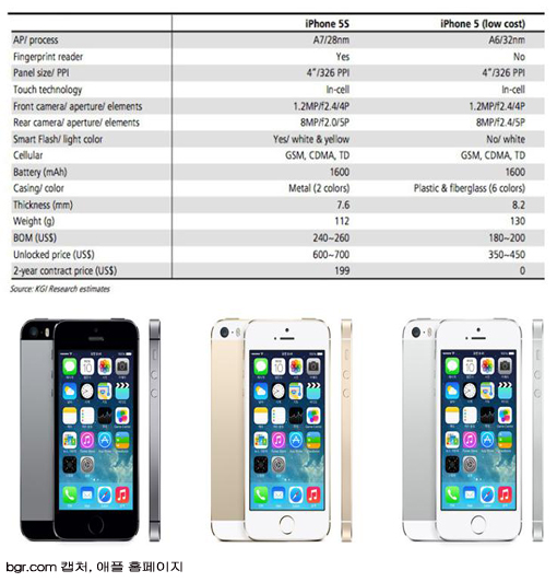 밍치궈는 지난달 아예 아이폰5S와 5C의 ‘예상 제품사양표(위 사진)’를 공개했다.
