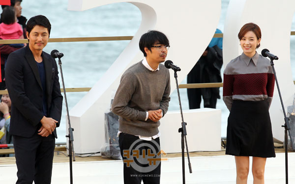 [쿠키 연예] 6일 오후 부산 해운대구 우동 비프빌리지에서 영화 ‘감시자들’ 무대인사가 열렸다. 이날 행사에 참석한 배우 정우성, 감독 조의석, 배우 한효주가 관객과 즐거운 시간을 보내고 있다.
