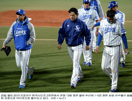 1차전은 너무 오래 쉰 탓에 다소 무뎌진 경기감각에 원인을 돌릴 수도 있다. 하지만 삼성 타선은 2차전에서도 전혀 나아지지 못했다. 두산이 1차전(12개)이어 2차전에서도 두자릿수 안타(10개)를 몰아치는 동안 삼성은 2차전에서도 안타 7개에 그치며 홈을 단 한 번만 밟았다. 더구나 연장전까지 이어진 2차전은 9이닝도 아닌 13이닝이었다.