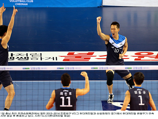 현대캐피탈은 1일 충남 천안 유관순체육관에서 열린 ‘2013-2014 NH농협 V-리그’ 삼성화재와의 라이벌전에서 42점을 퍼부은 용병 리버만 아가메즈의 맹활약에 힘입어 3-1(25-23 25-21 25-27 28-26)로 승리했다.