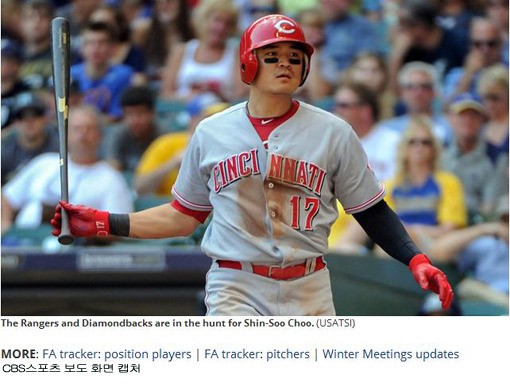 미국 스포츠 전문 매체 ESPN은 16일(한국시간) 공식 블로그에 올린 ‘남은 오프시즌의 10가지 전망(Ten predictions for rest of offseason)’이란 제목의 글에서 첫번째 전망으로 ‘추신수는 레인저스와 계약할 것(The Rangers sign Shin-Soo Choo)’이라고 소개했다.