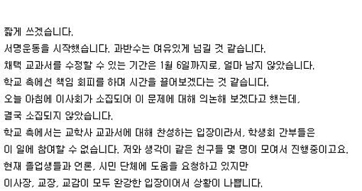 이 네티즌은 4일 커뮤니티사이트인 ‘오늘의 유머’에 올린 ‘상산고 학생입니다, 상황이 좋지 않습니다. 최대한 퍼트려 주세요’라는 제목의 글에서 “서명운동을 시작했다. 과반수는 여유있게 넘길 것 같다”라며 “채택 교과서를 수정할 수 있는 기간은 1월 6일까지로, 얼마 남지 않았다”라고 밝혔다.