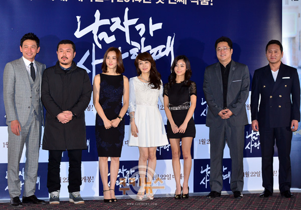 [쿠키 연예] 13일 오후 서울 행당동 CGV 왕십리에서 ‘남자가 사랑할 때’ 언론시사회가 열렸다. 한동욱 감독을 비롯한 출연진들이 취재진에게 포즈를 취하고 있다.