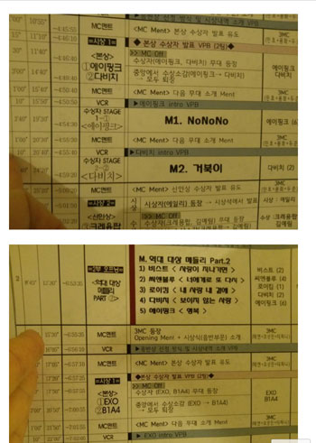 여기에는 각 순서의 시간과 함께 ‘수상자(에이핑크, 다비치) 무대 등장’ ‘중앙에서 수상소감(에이핑크→다비치)’ 등 행사 내용이 구체적으로 기재돼 있다. 여기에 따르면 에이핑크, 다비치, EXO, B1A4가 본상을 수상하는 것으로 돼 있다.