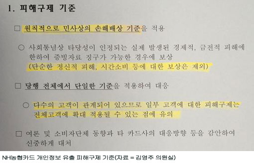 여기에서 NH농협카드는 ‘사회통념상 타당성이 인정되는 실제 발생된 경제적, 금전적 피해에 한하여 증빙자료 징구가 가능한 경우에 보상’이라며 괄호를 통해 ‘단순한 정신적 피해, 시간소비 등에 대한 보상은 제외’라고 부연했다,