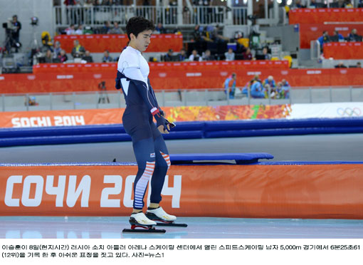 이승훈은 8일(한국시간) 러시아 소치 아들레르 아레나에서 열린 남자 스피드스케이팅 5000m 경기에서 6분25초61을 기록하며 12위에 그쳤다.
