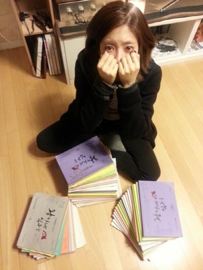 사진 속 이윤지는 ‘왕가네 식구들’ 대본을 주변에 쌓아놓고, 눈물고인 채 충혈된 눈으로 카메라를 응시하고 있다. 울면서 마지막회 방송을 본 직후 찍은 사진이라고 전했다.