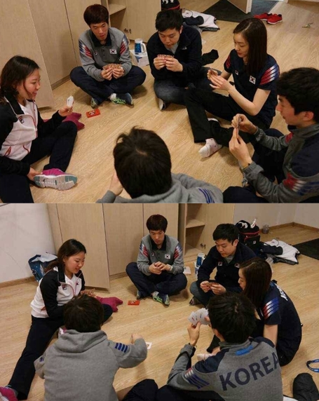 사진 속 김연아는 쇼트트랙 신다운, 박세영(21), 피겨스케이팅 김해진(17) 등과 함께 카드 게임을 즐기고 있다. 혼자 신발까지 벗은 채 진지한 모습으로 임해 보는 이들로 하여금 웃음을 자아낸다.