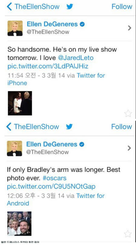 엘렌은 메릴 스트립, 제니퍼 로렌스, 브래드 피트, 브래들리 쿠퍼 등 쟁쟁한 스타들이 함께 담긴 이 사진을 곧바로 트위터(아래 캡처화면)에 올렸다. 격식을 버린 자유분방한 모습에 관심은 커졌고, 사진은 리트윗(타인의 멘션을 자신의 트위터에도 가져오는 것) 270만번을 기록하는 등 그야말로 ‘대박’이 났다.