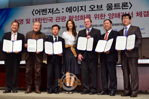 [쿠키 연예]18일 오전 서울 태평로 프레스센터에서 마블 스튜디오의 ‘어벤져스: 에이지 오브 울트론’ 촬영 및 대한민국 관광 활상화를 위한 양해각서 체결식이 열렸다. 고양지식정보산업진흥원 김인환 원장, 서울영상위원회 이장호 위원장, 영화진흥위원회 김의석 위원장, 배우 수현, 마블 대표 변호사 데이비드 가루치, 한국관광공사 강기홍 부사장, 경기영상위원회 서용우 사무국장(사진 왼쪽부터)이 양해각서를 들고 포즈를 취하고 있다.