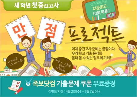 [쿠키 생활] 교육 전문 그룹 비상교육(대표 양태회)의 중학생 대상 인터넷강의 사이트 수박씨닷컴(www.soobakc.com)과 초등학생 대상 인터넷강의 사이트 아이수박씨(www.isoobakc.com)는 1학기 중간고사를 대비해 기출문제 쿠폰을 증정하는 ‘중간고사 만점 프로젝트’ 이벤트를 실시한다고 8일 밝혔다.