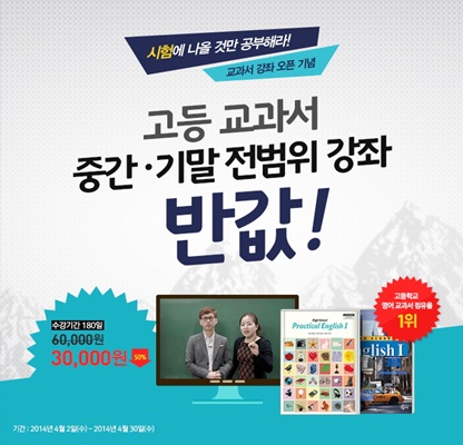 [쿠키 생활] 영어교육 전문 기업 능률교육(대표 황도순)이 운영하는 중·고등 영어학습사이트 ‘틴즈업(www.teensup.com)’은 고등학교 영어 교과서 강좌 오픈을 기념해 오는 30일까지 ‘수강료 50% 할인’이벤트를 진행한다고 전했다.