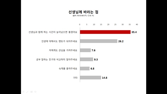 스승의 날을 맞아 선생님에게 바라는 점을 물은 질문에는 ‘수업 시간 외에도 선생님과 함께 하는 시간이 늘어났으면 좋겠어요(35.4%)’가 1위를, ‘인생에 대해서도 멘토가 되어주세요(26.2%)’가 2위를 차지해 10명 중 6명이 선생님과 성적이나 진로에 대해 속 깊은 대화를 나누고 싶어한다는 것을 읽을 수 있었다.