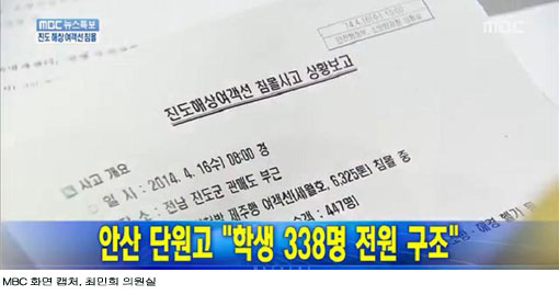 최민희 새정치민주연합 의원이 21일 보도자료를 통해 공개한 방송통신심의위원회 자료에 따르면 MBC에서 학생 전원 구조 오보가 나온 시간은 4월 16일 오전 11시 1분이다. 이는 경기도교육청 대책반이 기자들에게 ‘단원고 학생 전원 구조’ 문자를 보낸 11시 9분보다 8분 빠르다.