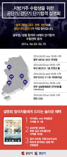 이번 설명회는 ‘지방거주 수험생을 위한 2015 공무원 및 경찰공무원 필합전략’을 주제로 진행되며, 공단기와 경단기가 분석한 최근 3년간 공무원시험 합격자 사례와 이를 토대로 마련된 단기합격 수험전략, 지방 거주 학생들의 효과적인 공무원 시험 준비법 등으로 꾸려질 예정이다. 6월 2일 오후 6시 광주를 시작으로, 3일에는 부산, 4일 대구, 5일 전주를 거쳐, 10일 천안까지 총 5개 도시를 순회할 예정이다.