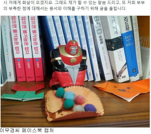 이씨는 글과 함께 고 후보 책상 위의 아이들 물건이라며 사진 한 장(사진)을 올렸다. 이 글과 사진은 이씨가 페이스북을 개설한 이후 첫 번째 게시물이다.