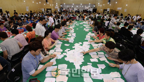 5일 오전 17개 지역 시·도 광역단체장 선거 개표 마감 결과 새정치민주연합은 총 9곳(서울 충남 세종 대전 전북 전남 광주 강원 충북)에서 승리, 8곳(인천 경기 경북 대구 울산 부산 경남 제주)을 가져간 새누리당을 힘겹게 앞질렀다.