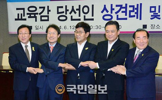 12일 서울 중구 프레스센터에서 열린 ‘교육감 당선인 상견례 및 기자회견’에 참석한 교육감 당선인들이 기념촬영을 하고 있다. 왼쪽부터 민병희 강원도교육감 당선인, 조희연 서울시교육감 당선인, 이청연 인천시교육감 당선인, 김병우 충북도교육감 당선인, 장휘국 광주시교육감 당선인.