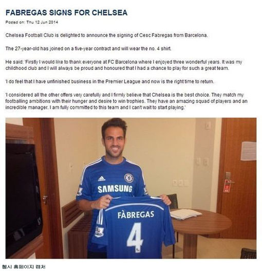 첼시는 13일(한국시간) 공식 홈페이지를 통해 “파브레가스와 5년 계약을 체결했다”고 밝혔다.