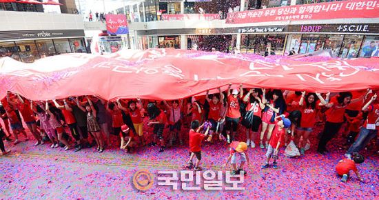 한국 축구 대표팀 응원단과 시민들이 15일 경기도 일산 원마운트 이벤트광장에서 열린 ‘2014 브라질월드컵 선전 기원 플래시몹’ 행사에 참석해 응원전을 펼치고 있다. 이곳에서는 한국과 러시아의 H조 조별리그 첫 경기가 열리는 18일을 비롯해 23일(알제리전)과 27일(벨기에전) 거리 응원전이 열린다.