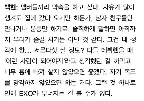 과거 백현은 한 매체와의 인터뷰에서 “멤버들끼리 약속을 하고 싶다. 자유가 많이 생겨도 집에 갔다 오기만 하든가, 남자 친구들만 만나거나 운동만 하기로. 솔직하게 말하면 아직까지 우리가 즐길 시기는 아닌 것 같다”라고 밝혔다.