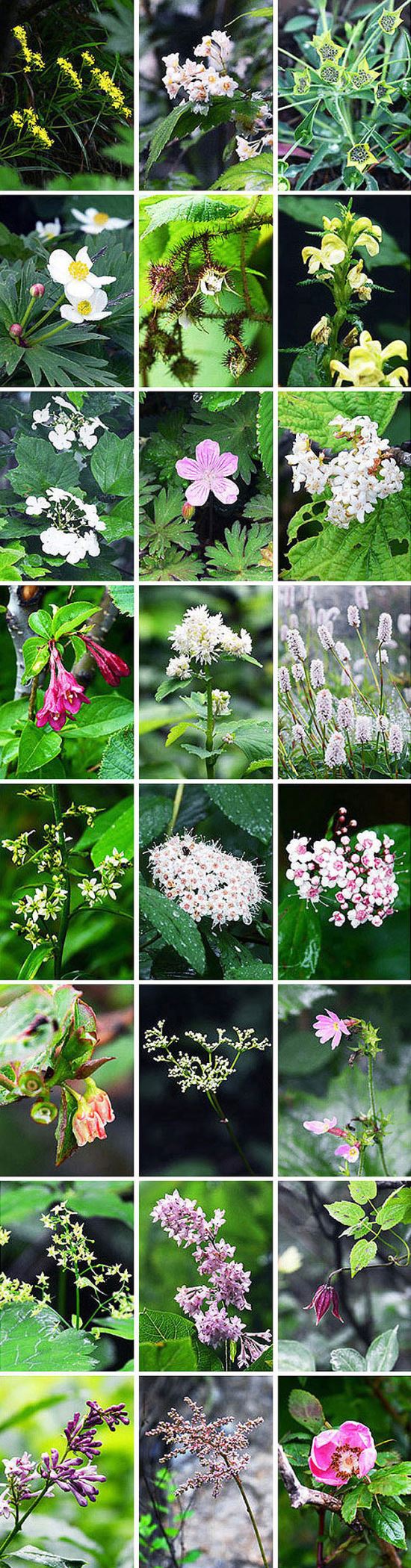 (사진 왼쪽 위부터 순서대로) 금마타리, 국수나무꽃, 등대시호, 바람꽃, 멍덕딸기꽃, 만주송이풀, 백당나무꽃, 털쥐손이, 배암나무꽃, 붉은병꽃나무꽃, 산꿩의다리, 범꼬리, 박새꽃, 참조팝나무, 좀조팝나무, 산앵도나무꽃, 터리풀꽃, 큰앵초, 큰꼭두서니, 꽃개회나무꽃, 세잎종덩굴, 정향나무꽃, 숙은노루오줌, 생열귀.