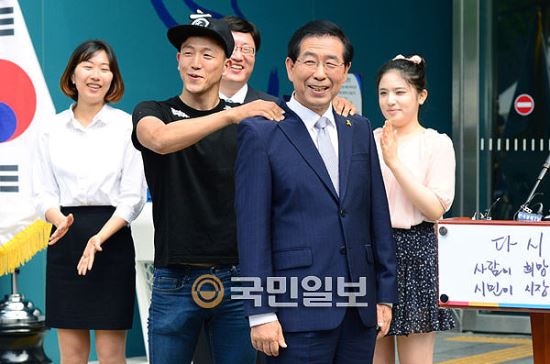 박원순 서울시장 취임식이 1일 서울시청 정문 앞에서 열렸다. 공식 취임식에 이어진 취임축하 퍼포먼스에서 진행자가 ‘수고하셨고, 더 수고하시란’ 의미로 박 시장의 어깨를 주물러주고 있다. 이번 취임식은 모든 과정이 시민들의 재능기부로 진행됐다.