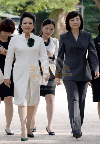펑 여사는 흰색 치마와 롱재킷에 진녹색 꽃 모양 브로치와 하이힐 차림으로 한국 궁궐 고유의 미(美)에 동화되는 듯한 분위기를 연출했다. 반면 조 수석은 짙은 회색의 더블 재킷과 바지를 입고 나서 펑 여사를 더욱 돋보이게 했다. 패션을 통한 ‘배려 외교’가 된 셈이다.