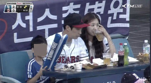 6일 서울 잠실야구장에서 열린 ‘2014 한국야쿠르트 세븐 프로야구’ 삼성 라이온즈와 두산 베어스와의 경기에서 공개연애 중인 장신영과 강경준의 데이트 모습이 중계 카메라에 포착됐다.