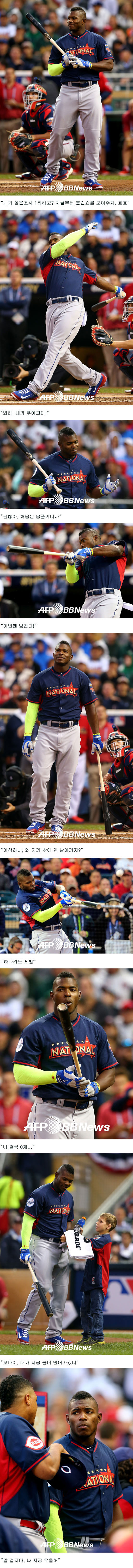 푸이그는 지난해 빅리그에 모습을 드러내자마자 출중한 기량과 창조적인 플레이로 팬들을 열광시키며 신드롬까지 불러일으킨 주인공입니다. 그런데 정작 올스타전 홈런더비에선 ‘꼴찌’. 어떻게든 팬들에게 즐거움을 주는 선수네요. 자신감에 넘치는 홈런더비 등장부터 민망한 퇴장까지 푸이그의 ‘표정변화’를 주제로 여러 장의 사진을 이어 만들어 봤습니다. 감상해보시죠.