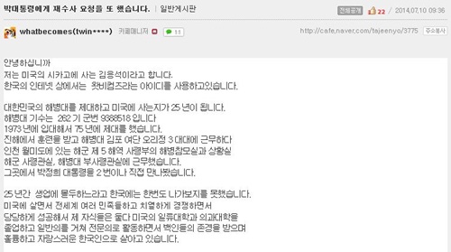 지난 10일 왓비컴즈는 ‘타진요’에 ‘박대통령에게 재수사 요청을 또 했습니다’라는 제목의 글을 올렸다.