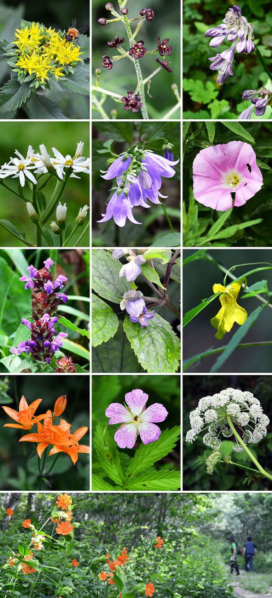 (사진 왼쪽 위부터 순서대로) 태백기린초, 여로, 일월비비추, 취나물꽃, 모싯대, 메꽃, 꿀풀, 병조희풀, 노란물봉선, 하늘나리, 둥근이질풀, 지리강활, 동자꽃 무리.