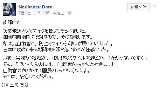 신문에 따르면 그는 젊은 시절 방공미사일 부대 등 6년 간 자위대에 근무했다. 도로씨는 아베 신조(安倍晋三) 내각이 각의(국무회의)에서 집단 자위권 행사를 용인하기로 결정하기 전날인 지난달 30일 고베(神戶)의 거리에서 마이크를 잡았다.