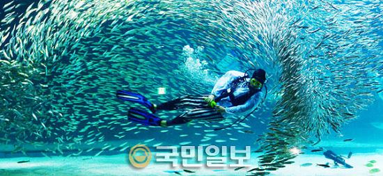 1일 서울 삼성동 코엑스 아쿠아리움에서 정어리떼가 잠수사들의 수중공연에 맞춰 멋진 군무를 선보이고 있다.