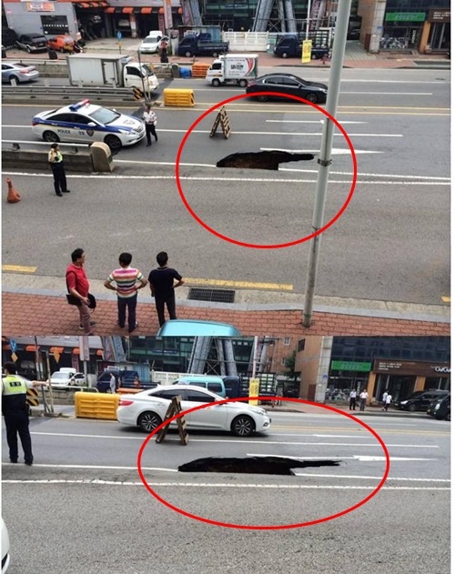 5일 서울 송파구 석촌동에 싱크홀이 생겼다는 소식과 함께 현장 사진이 각종 SNS를 통해 퍼지고 있다. 현장사진에는 잠실 부근의 석촌동 왕복 6차선 도로에 승용차가 빠질 크기만큼의 큰 구멍이 생겼다.