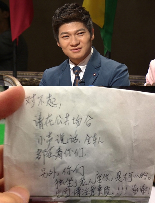 7일 온라인 커뮤니티에는 ‘장위안이 지하철에서 중국인에게 준 쪽지’라는 제목의 글과 중국어로 쓰여진 쪽지가 함께 올라와 있다.